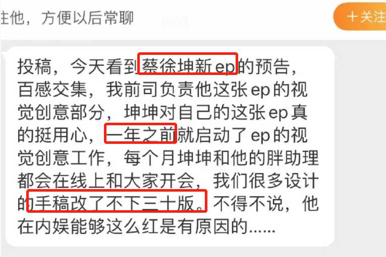 今天蔡徐坤發新ep,於是他的前合作方有人出來爆料說,蔡徐坤的這張ep早在一年前就開始籌備,而且蔡徐坤對此非常用心,每次會議都會參加,光是設計手稿就改了三十多版。