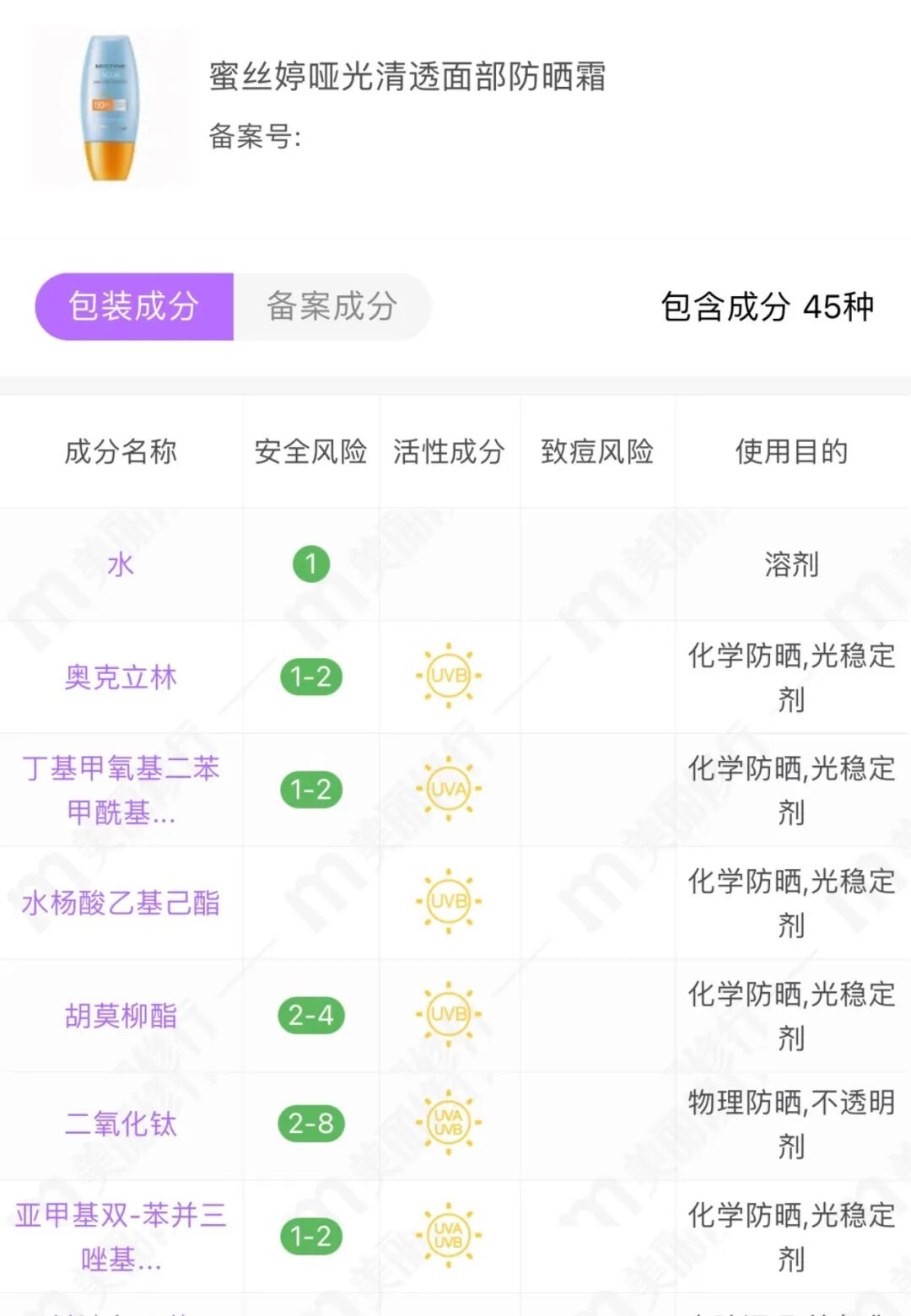 * “麥色濾是全波長UV防曬隔離系統,其下的兩個隔離防曬成分Mexoryl®、SX與Mexoryl®;XL的協同使用能夠形成強大的紫外線的過濾系統,有效阻擋UVA及UVB。” —— 百度百科