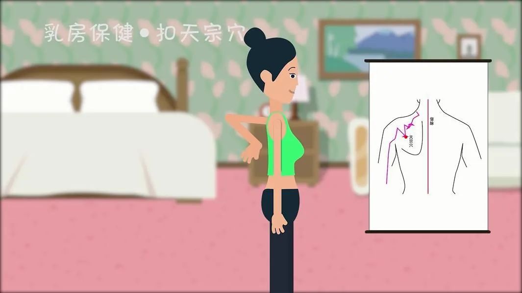 右手反手扣左肩胛骨,左手反手扣右肩胛骨,此動作鎮痛消腫,催乳止癰。