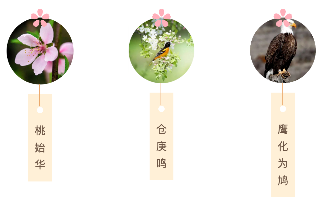 ● 鷹,鷙鳥也。此時鷹化為鳩,至秋則鳩復化為鷹。有人認為,鷹每年二三月飛返北方繁殖,已經不見跡影。只有斑鳩飛出來,於是古人以為春天的斑鳩是由秋天的老鷹變化出來的。意為春氣溫和,連鷹都變得像斑鳩一樣溫柔了。