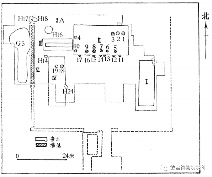 需要補充的是,1984-1986年在侯馬呈王路發掘的13號地點建築以Ⅱ號基址為中心〔圖四〕,其東南、西南分別為Ⅰ號、Ⅳ號建築基址,呈“品”字形分佈,合圍成庭,三面環繞垣牆(Ⅴ號)。Ⅱ號基址為橫長方形的主體建築,應面闊九間,其東北角外有“階”。Ⅱ號西連長條形的Ⅲ號基址。Ⅰ號、Ⅳ號東西對稱,均為縱長方形。圍牆南部正中有東西對稱的夯土基址,應為門塾。13地點建築的佈局形制與馬家莊、雲塘建築大同小異;其西60米處的26號地點還發現百餘座祭祀坑,因此發掘者認為包括13號地點在內的呈王路基址群為晉都新田的宗廟。在該基址群的東、東南、南、西南皆有祭祀遺址,形成了一個半徑不超過1000米的半圓形祭祀遺址帶,以它為祭祀活動的中心和祭祀對象。從這種方位關係看發掘者的意見可以信從。