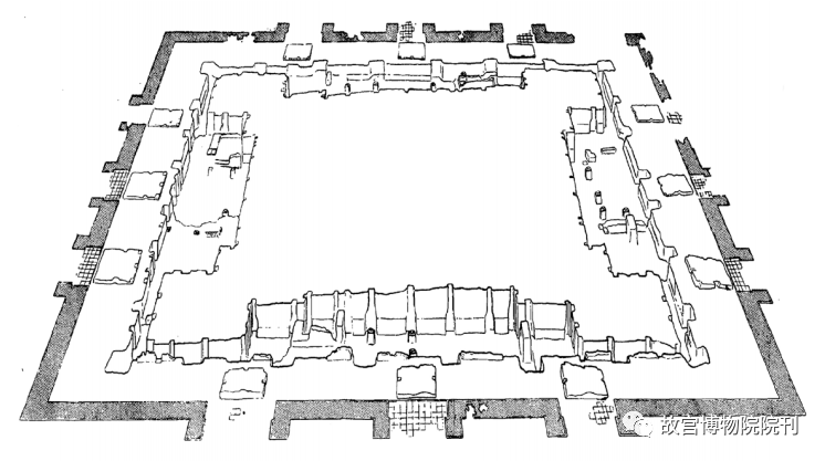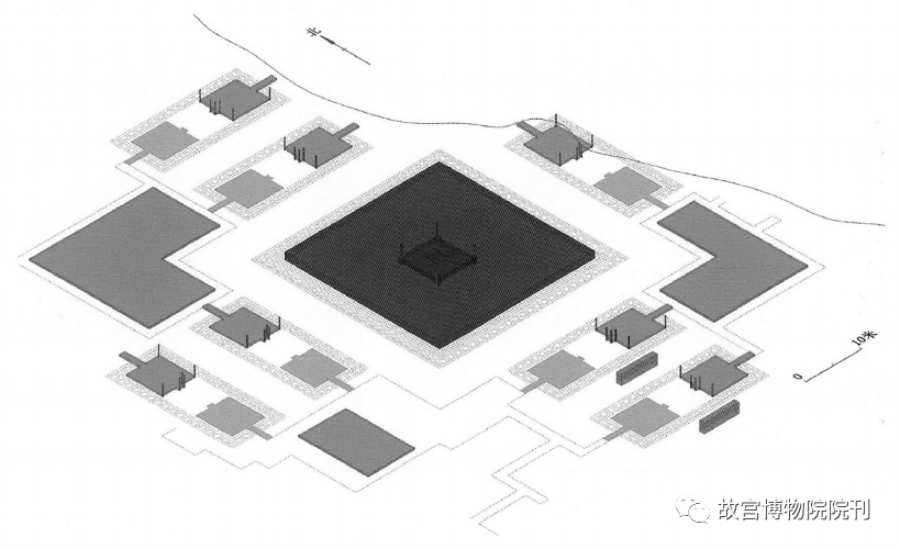 每座小院落平面均呈“回”字形,即由外周方形的夯土圍牆、圍牆四隅內曲尺形配房、四門和中心建築基址組成〔圖六〕。圍牆邊長260—280米,第一至十一號院落中心基址邊長55米,第十二號中心基址邊長100米。以第三號院落為例〔圖七〕,中心建築臺基呈“亞”字形,殘高4.5米,其中間部分邊長27.5米,四角各伸出一個邊長7.3米的小方臺,二者結合處各有雙柺角。中心臺基四面缺口部分均由中間的“堂”和左右“個”組成,“堂”與“個”以土坯牆相隔。四堂之間有繞過臺基四角的迴廊相通。迴廊外圍有一週高出廳堂地面0.5米的夯基(檻牆),其上每面各有三個平面方形的小夯土臺,它們的前面各有一段磚路,中間磚路正對院落四門門道。整個中心建築環繞石鋪散水。曲尺形配房似為廊屋式。四門正中有門道,門道兩旁有夯築土臺,似為門塾。