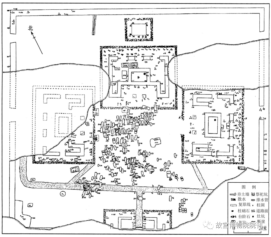1981-1984年發掘的雍城馬家莊一號建築群坐北向南,由“品”字形分佈的廟寢、東廂、西廂,南部的門塾以及中庭組成,四周環繞圍牆,形成一個閉合空間〔圖三〕。門塾與廟寢在同一南北中軸線上,由門道、東西內外塾組成。外圍牆的東牆北段、中段各有一門址;西牆北段有一門址。廟寢居中偏北,建築的夯牆輪廓平面為凹字形,其正中缺口部分為前堂,面闊三間;前簷無牆,有兩個夯土墩作為雙楹基礎。堂後有長方形的正室。前堂、正室兩側有曲尺形夾室,其後為北三室,均為長方形明間,共有三門。建築四周有迴廊和散水。廟堂前散水處有石鋪漫道式臺階(東階和西階)。東、西廂在廟寢南東西兩側左右對稱,坐東向西或坐西向東,平面格局亦為“凹”字形,只是通往南北夾室的門是開在堂之後牆的兩端。廟寢之北有一亭臺式建築,平面呈長方形,四周無簷牆,四角各有兩個角柱;亭臺四周亦有散水圍繞。中庭為一中間凹下,四周稍高的空場。在遺址內發現各類祭祀坑181個,以牛坑、羊坑為主,還有部分空坑,以及少量的牛羊同坑、人坑、人羊同坑、車坑;絕大多數分佈在中庭,僅少數在建築內發現。打破建築地面的坑內出土春秋晚期或戰國早期的陶器,表明了建築使用的年代下限。