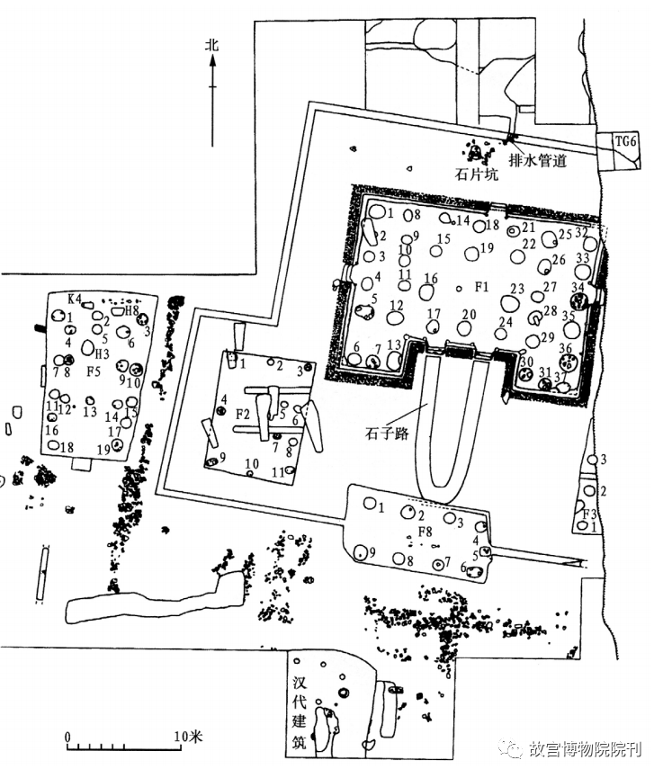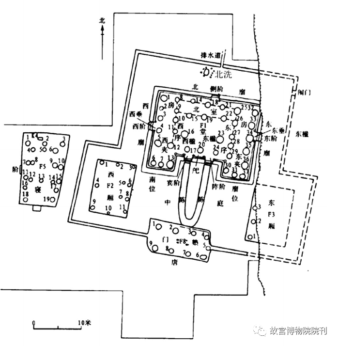 發掘者認為主體建築(F1、F4)的結構與前人宮廟復原研究相契合〔圖二〕。F2、F3為東、西廂或東、西堂,它們與F1的關係符合《爾雅·釋宮》“室有東西廂曰廟”的記載。主體建築及F2、F3臺基周圍未見瓦片,與周人宗廟“茅茨土階”記載吻合;F5東、南側瓦礫堆積較多,應為廟西之“寢”。院落裡玉石器和銅禮器殘片可能是禮儀用品殘留。因此這兩組基址極有可能是宗廟性質建築。