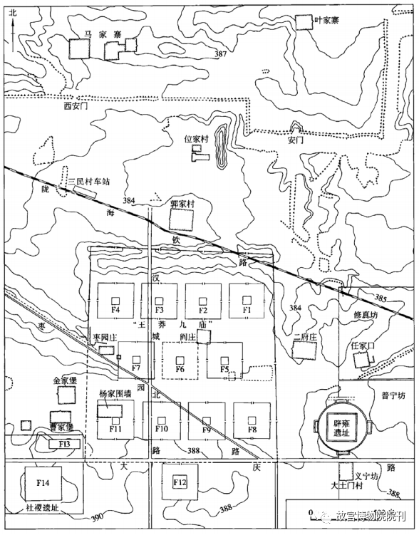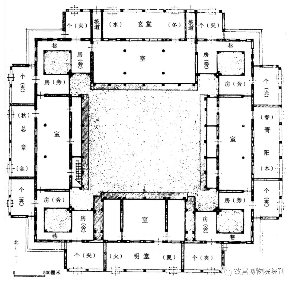 關於建築各部分結構定名,發掘者認為中心建築臺基上的中間部分為“太室”,四角伸出的小方臺為“夾室”,四面各有一“堂”,可依《禮記·月令》把東堂叫“青陽”,南堂叫“明堂”,西堂叫“總章”,北堂叫“玄堂”。此說大體無誤,但中心臺基是秦漢流行的夯土墩臺建築核心部分——墉,主要作為樑柱架構的依靠;形制相似的西安南郊大土門村“明堂”遺址,其中心臺基四角各伸出2個小臺,楊鴻勳先生指出四隅的8個小臺並非建築基座。“九廟”的中心臺基較大土門“明堂”有所簡化,後者四角自外向內的第二小臺被前者簡化成雙柺角,前者四角的小方臺自然不是小室的基座,即非“夾室”。“夾室”其實是“堂”左右兩側用土坯牆(“序”)隔出的空間,即左右“個”。中心臺基上主體部分確應叫“太室”,西漢宗廟已有“太室”,《漢舊儀》雲:“高帝崩三日,小斂室中牖下。作慄木主,長八寸,前方後圓,圍一尺,⋯⋯已葬,收主。為木函,藏廟太室中西牆壁埳中。”如此,“九廟”中心建築為四堂八個共一太室的結構。
