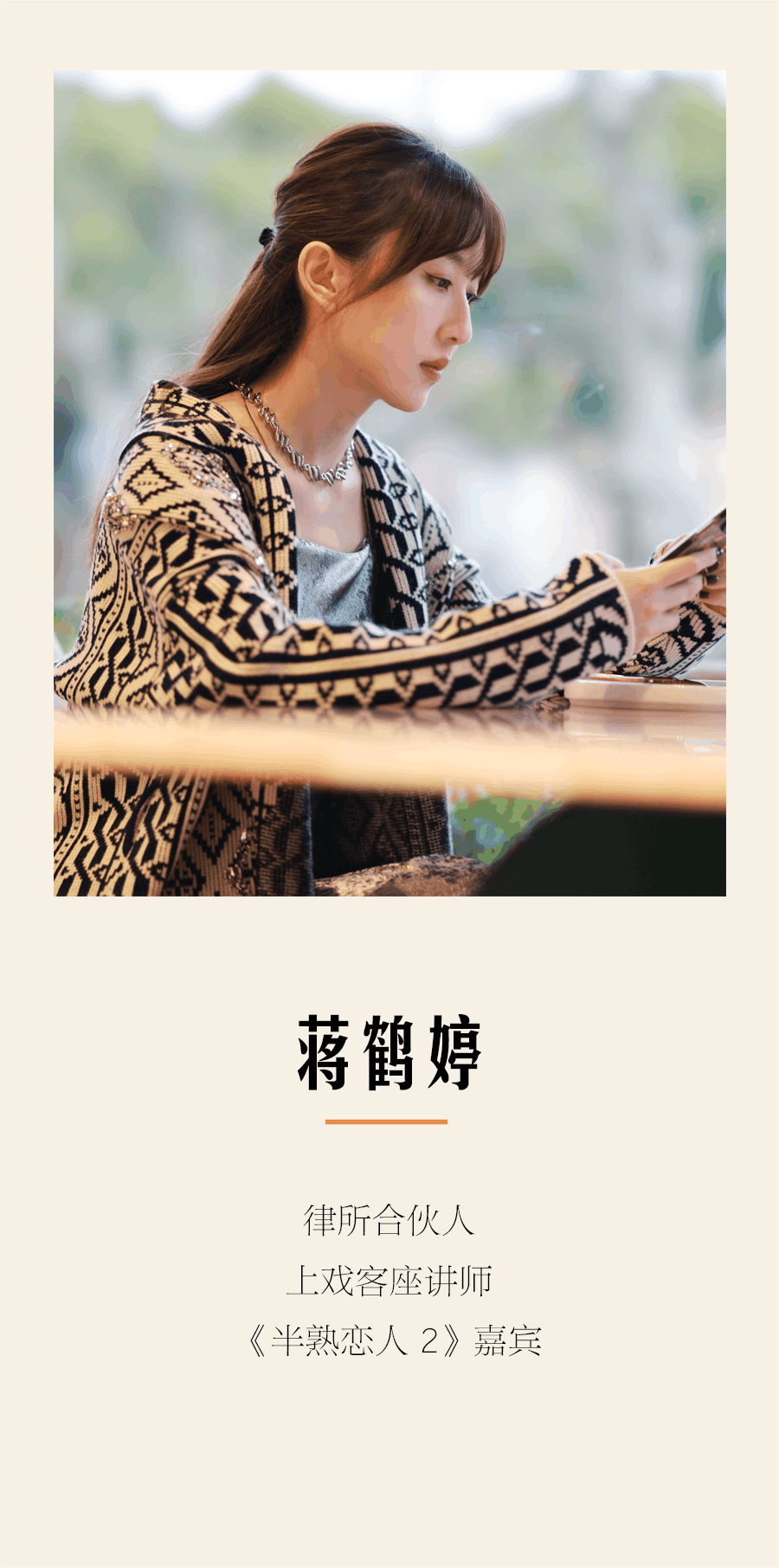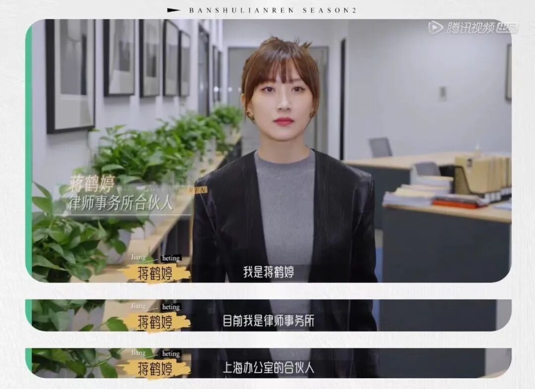 《半熟戀人》第二季中,蔣鶴婷就是這樣的存在,出場時的仰拍鏡頭、工作狀態的剪切、南加州大學碩士的教育經歷,加上律所合夥人、上戲客座講師身份。