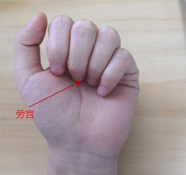 勞宮穴在手掌,橫平第3掌指關節近端,第2、3掌骨之間偏於第3掌骨。握拳屈指時,中指尖點到處即是。