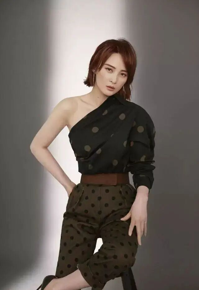 蔣勤勤也能駕馭性感又霸氣的風格。衣服和褲子上下的波點在設計和顏色上都相互呼應,看起來完全不會凌亂。不對稱的上衣設計露出一邊肩膀,將性感的鎖骨和肩部曲線展露無遺,同時帶有褶皺感,豐富了層次感,很是耐看。
