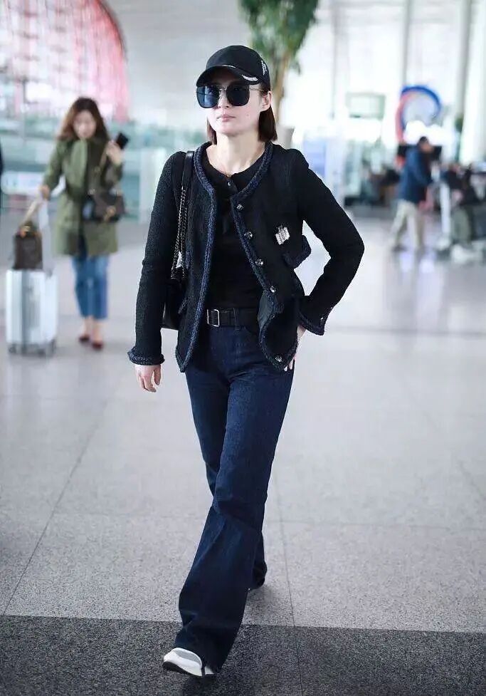在這張機場照中,蔣勤勤選擇了最簡單的黑色圓領內搭,配上同樣圓領的外套,展現了修長的頸部曲線。黑色的小香風毛呢外套低調溫婉,深藍色的一圈毛邊很有層次感,避免了視覺上的單調感,修身的版型也使蔣勤勤看起來十分精神。下身則是休閒的牛仔褲和運動鞋,和上身優雅的外套相中和,優雅大氣,滿滿的時尚感。