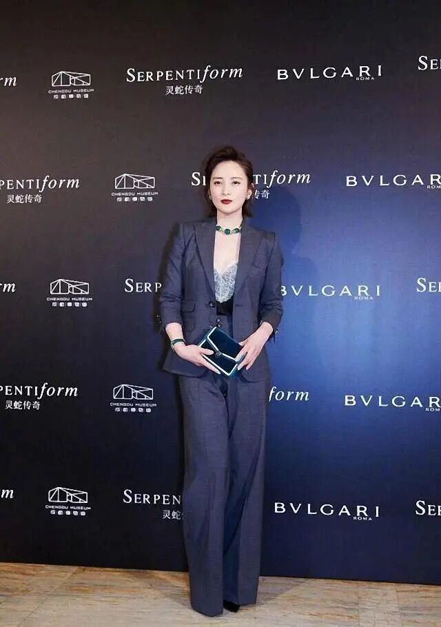 蔣勤勤不僅穿裙裝優雅,就連西裝也穿得女人味十足,蕾絲的打底衫極具女性魅力,一半白色蕾絲和一半黑色綢緞的拼接性感又優雅,深V的版型露出了一大截皮膚,而頸間的翡翠項鍊完美填補了這邊空白,看起來一點也不單調。蕾絲內搭和正式的西裝相搭配,兩種風格相碰撞,幹練又嫵媚。