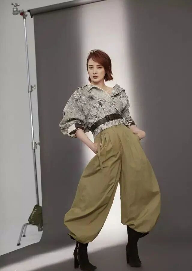 蔣勤勤能很好的駕馭帥氣風格,韓版的灰色牛仔外套十分寬鬆,領口敞開後就變成了霸氣的V領。腰間的黑色寬腰帶勒出了她纖細的小蠻腰,也自然地過渡到下身的燈籠褲。腳上再踩一雙方跟高跟鞋,簡直是氣質女神。