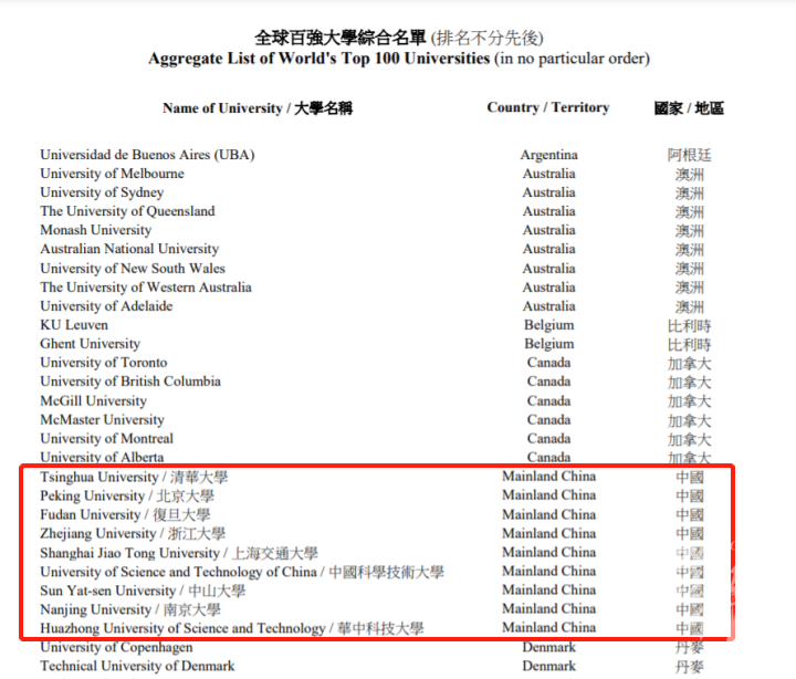 B、C兩類中的全球百強大學中,內地滿足該條件的高校有9所——清華大學、北京大學、復旦大學、浙江大學、上海交通大學、中國科學技術大學、中山大學、南京大學,以及華中科技大學,形成了清北+華五+華科大+中山大學的九校格局。