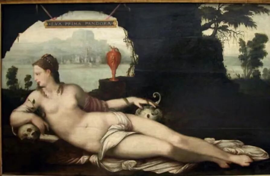 16世紀楓丹白露畫派的老古贊就把這兩個女人形象融為了一體,創作了那幅著名的《潘多拉魔瓶前的夏娃》。
