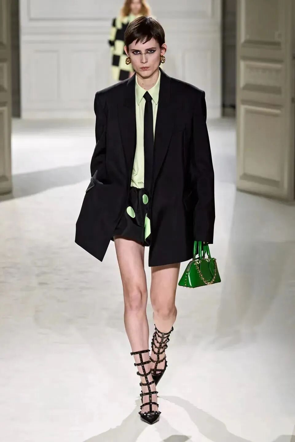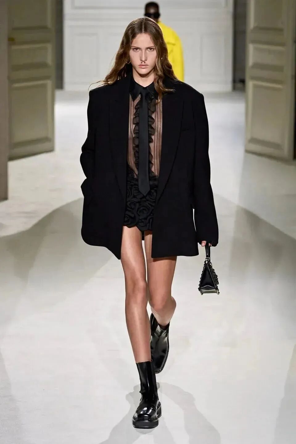 領帶被Valentino重新詮釋為強調人性、彰顯個性的焦點,正如PP想通過黑領帶傳遞的力量一樣:Valentino women在破立間獲得新生,我們對正裝的看法也被顛覆,習以為常的規則也因此被打破。