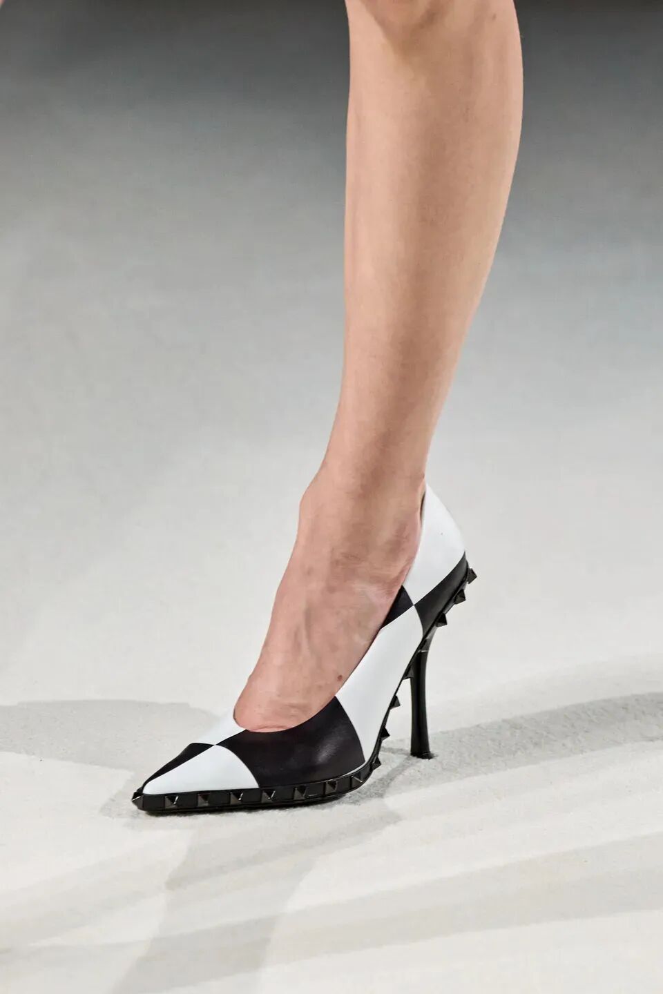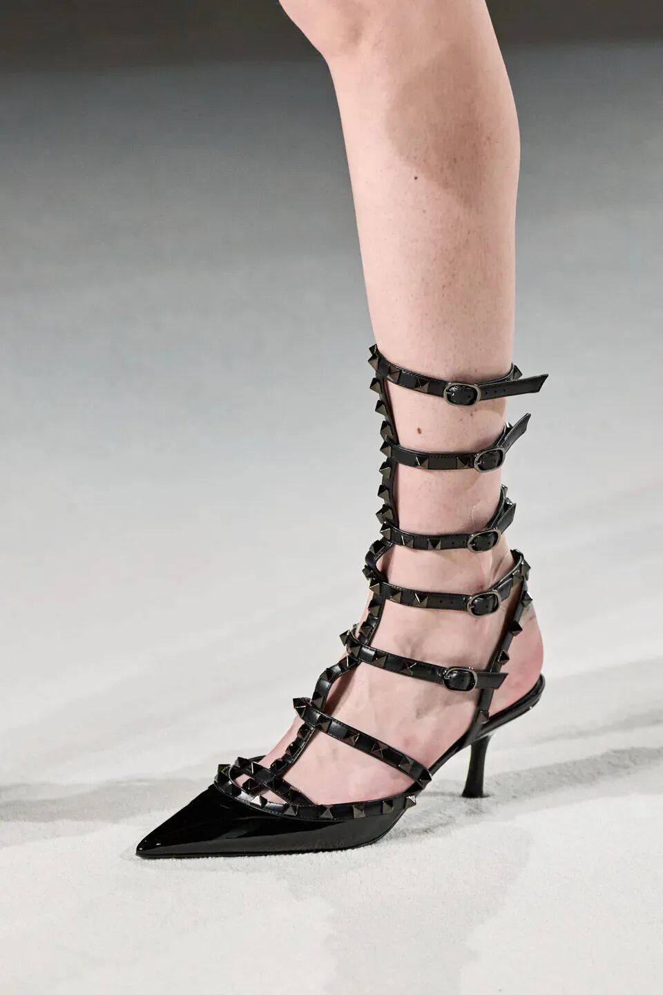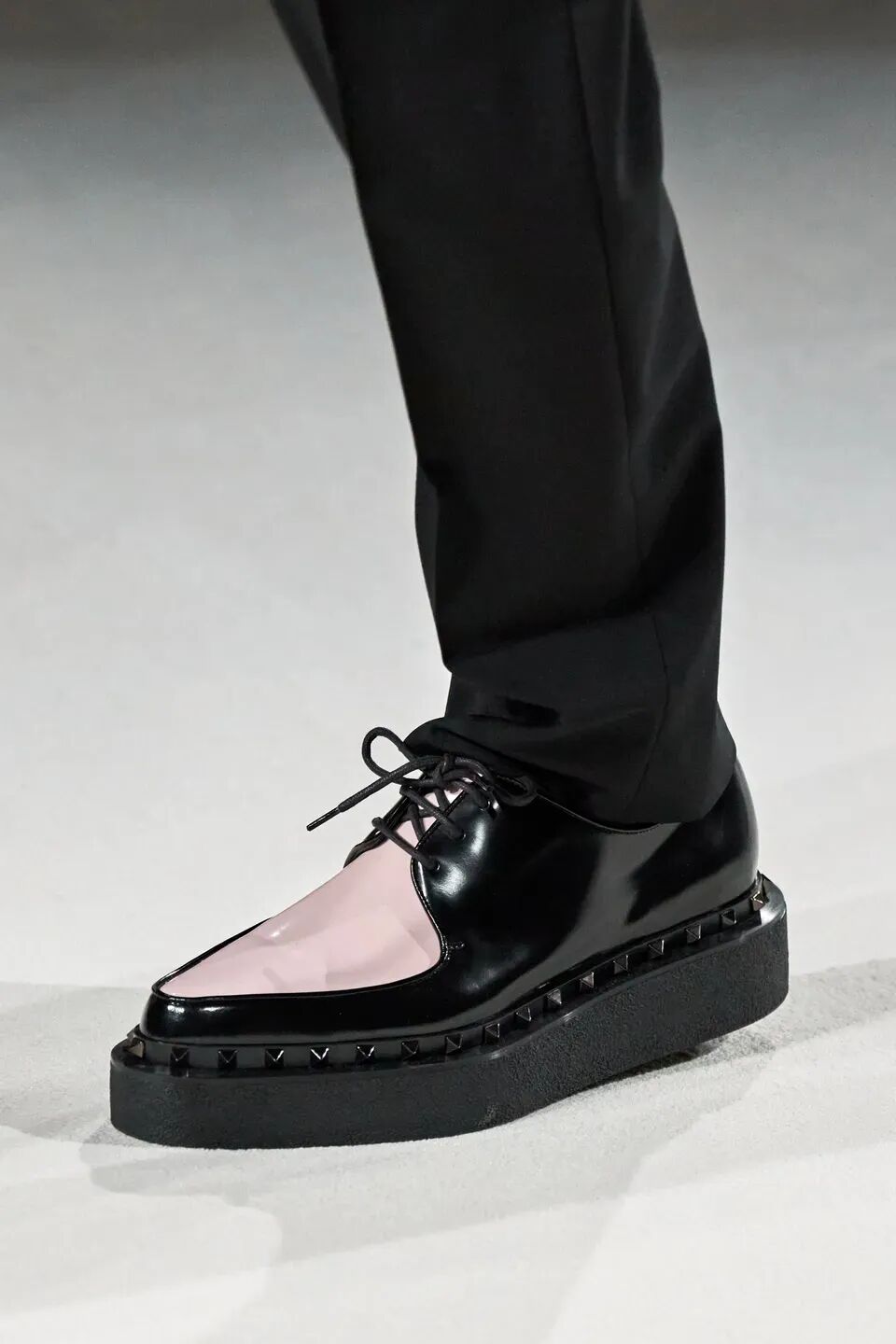 鞋履的風格同樣多變。大家熟悉的鉚釘小尖頭增加了綁帶圈數,透著犀利氣場;帶有鉚釘裝飾的尖頭高跟與Black Tie的帥氣完美合拍;更適合日常穿著的短靴、樂福鞋在鉚釘的裝飾下也極具華倫天奴風采。