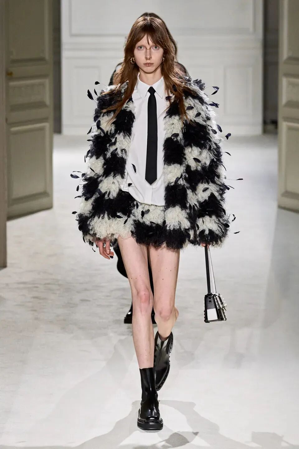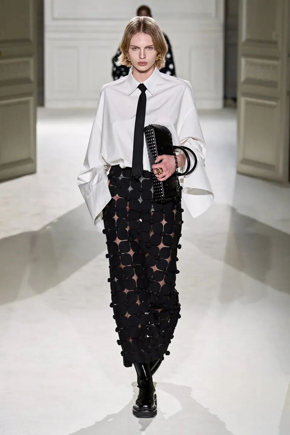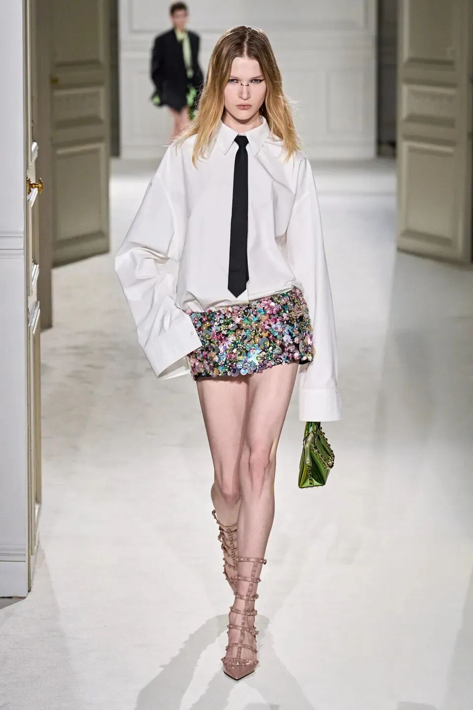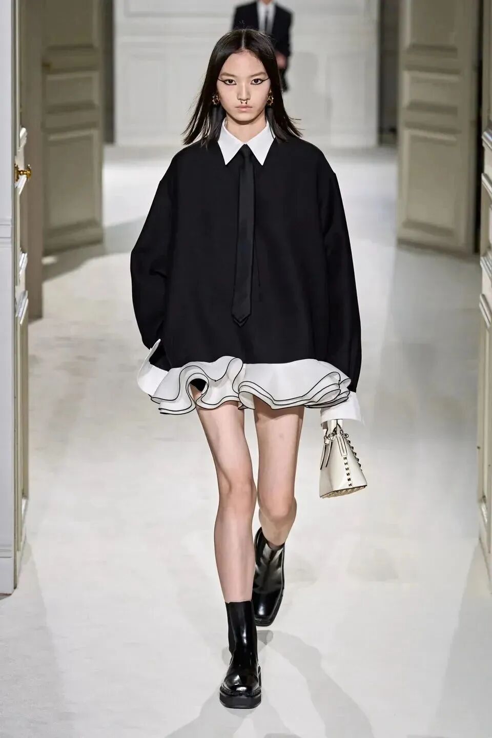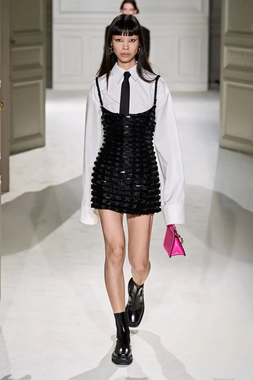 PP手中的“華倫天奴經典印象”在本季被一再強調。前一陣子剛剛出現在Zendaya身上的玫瑰禮服,以短裙形態出現在日裝搭配中,領帶加持,玫瑰有了強有力的個性特點。