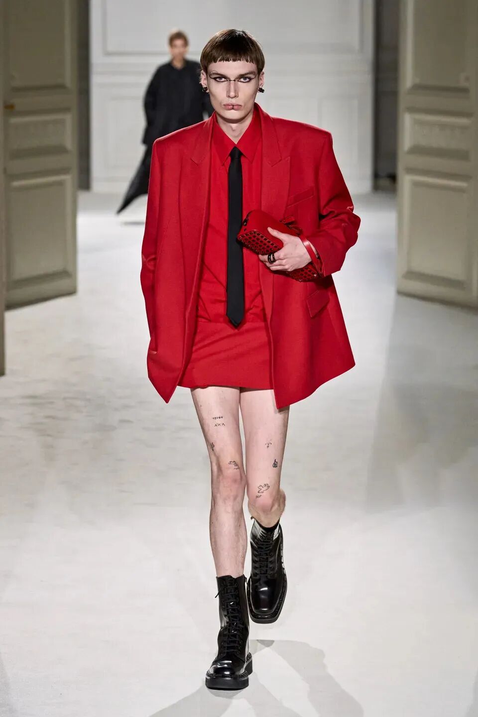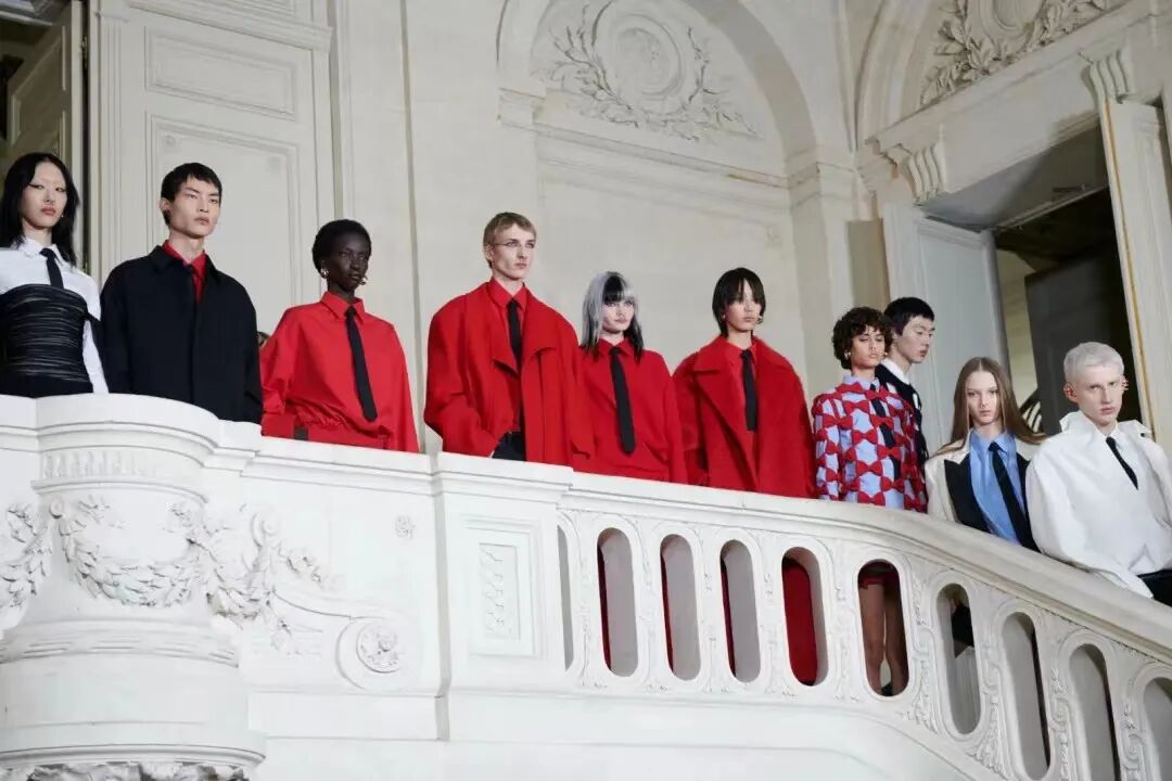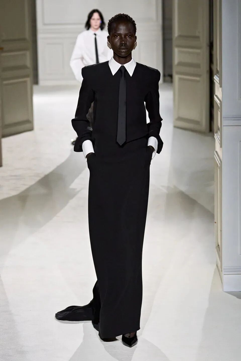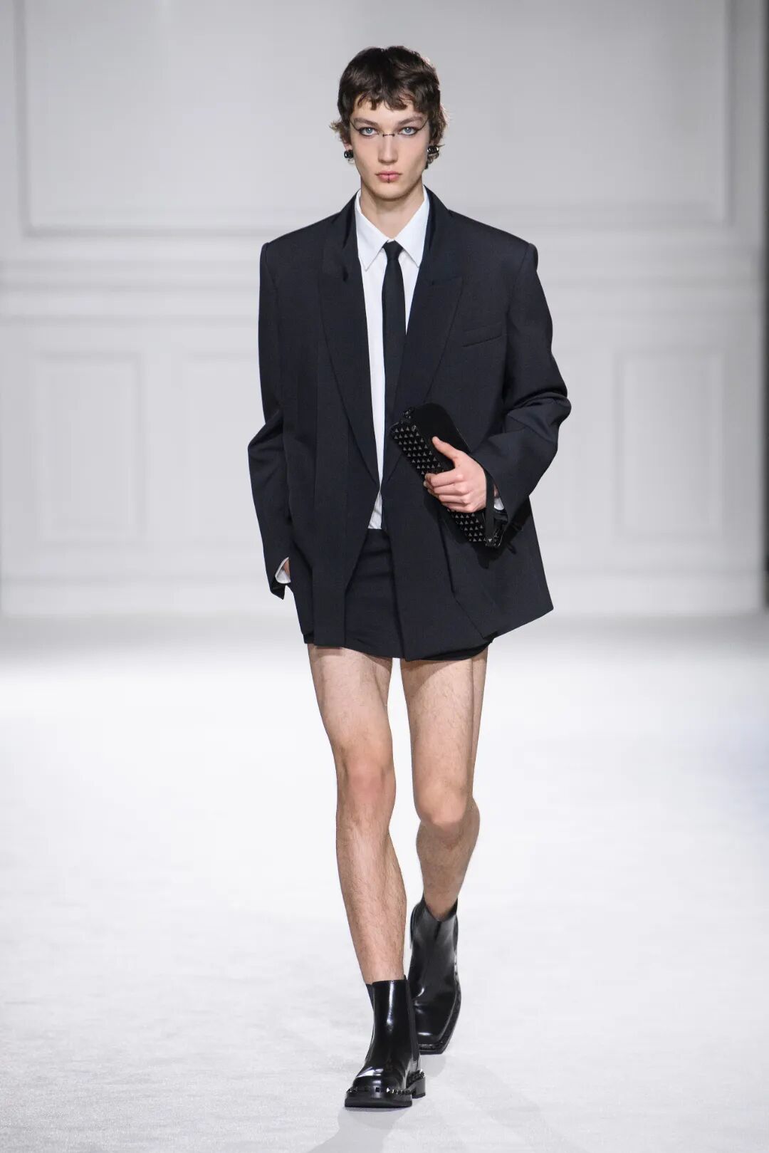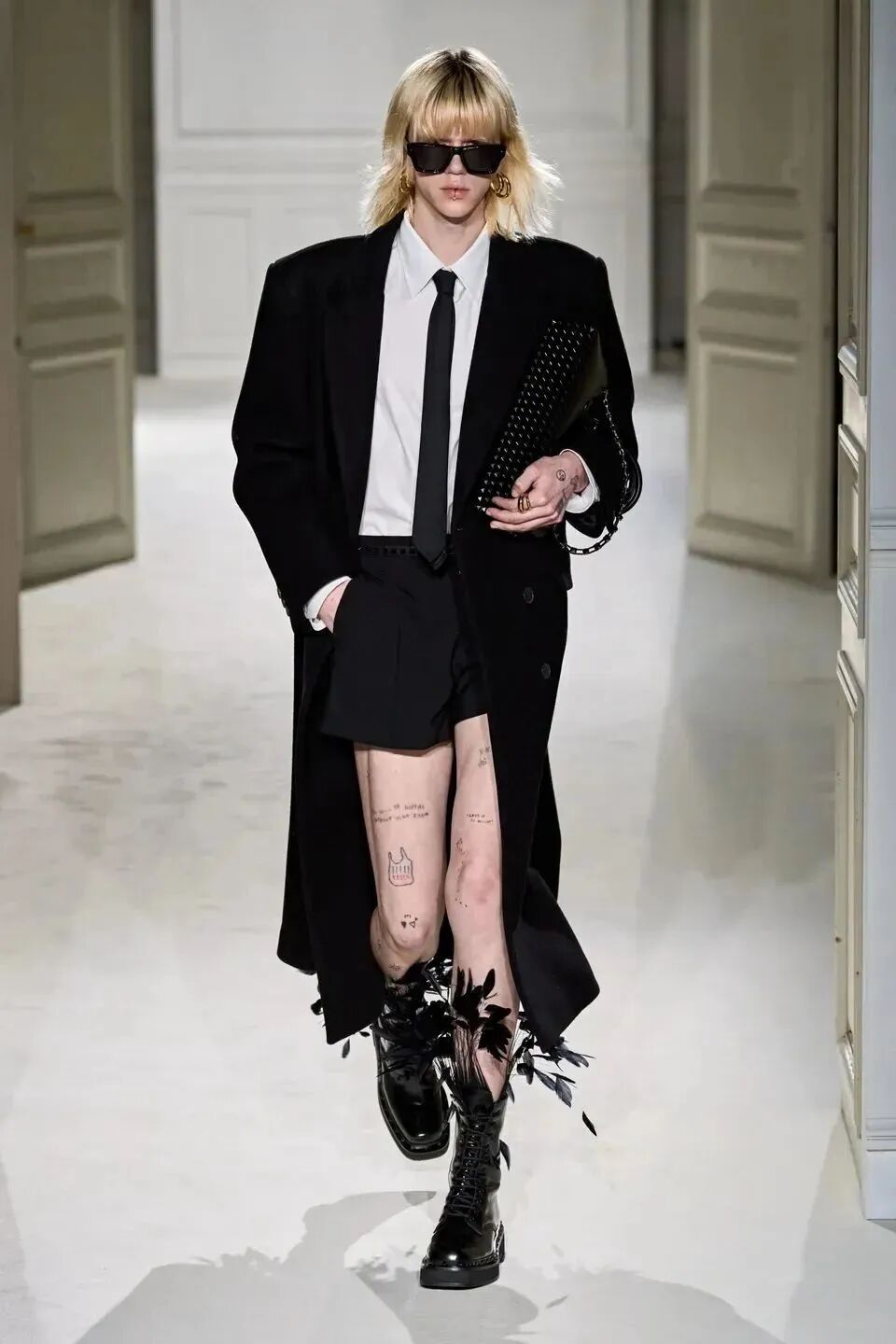 作為標誌性符號的領帶被移形化用,變幻為不同的時裝形態:領帶被解開,不再拘泥於原有佩戴樣式,在日裝和晚裝之間自如切換。領帶的意識形態幻想受到挑戰,最終被完全顛覆,獲得截然不同的新的解讀,2023秋冬系列的風向標一下子有了鮮明的輪廓。