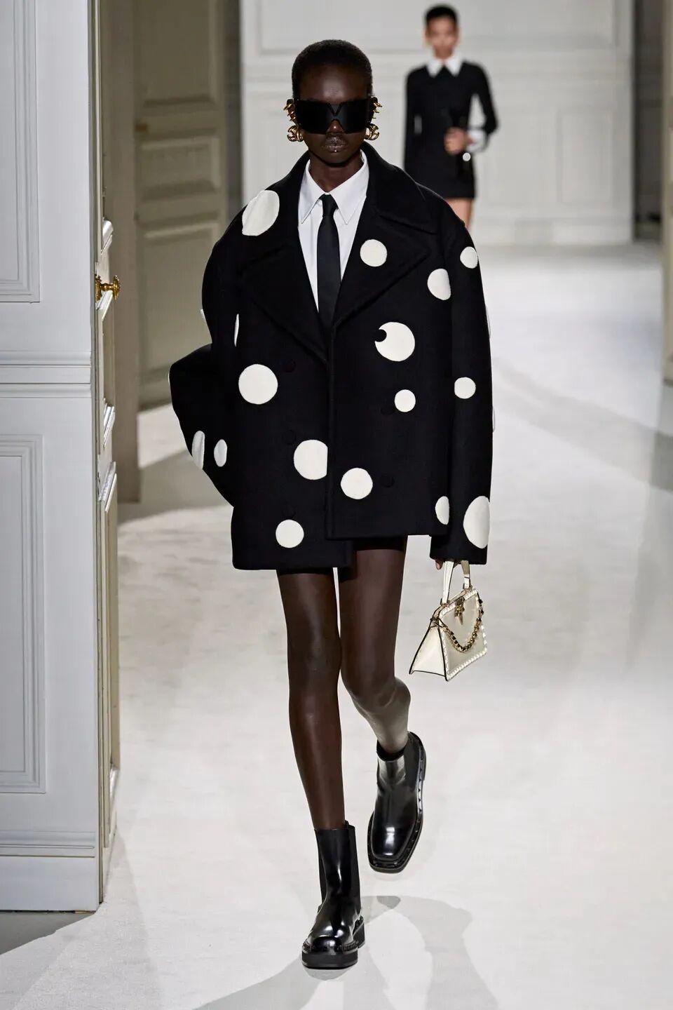 在以實用性剪裁為重心的日裝中,簡約配色凸顯的活力、生機與現代性無疑是極具創造力和吸引力的。但PP打造的驚喜不止於此,標誌性的V logo被放大裝飾在成衣上,別出心裁的大小波點誇張點綴,為色彩增加一抹極具視覺衝擊力的體驗。
