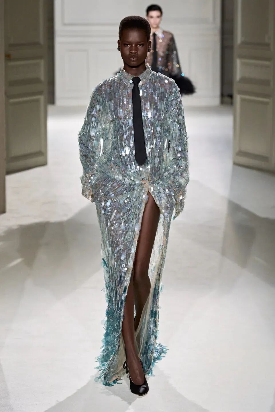 波光粼粼的亮片與飄飄欲仙的羽毛同樣不容忽視。在亮片的裝點下,優秀的剪裁毫無保留地展現在眼前,若非極致,豈能仙美?