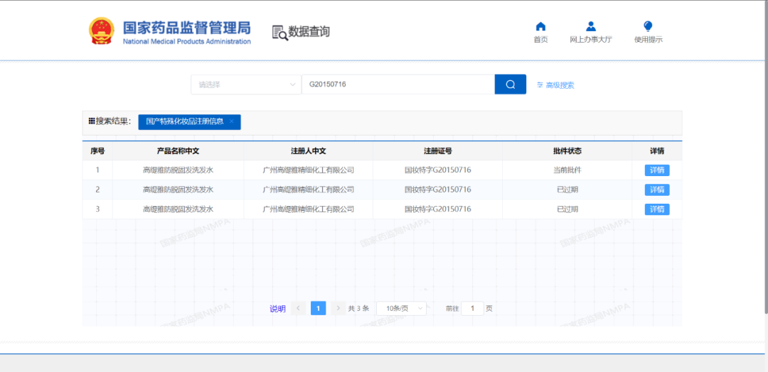 而我們在國家藥品監督管理局查詢後發現,該批准文號對應且狀態是“當前批件”的是一款名為“高緹雅防脫固發洗髮水”的產品,廠家為廣州高緹雅精細化工有限公司。