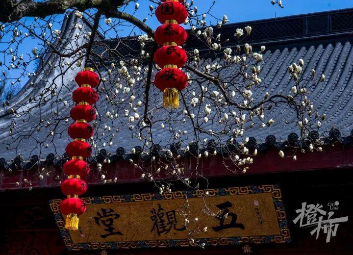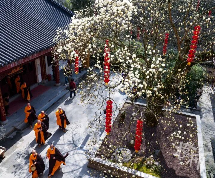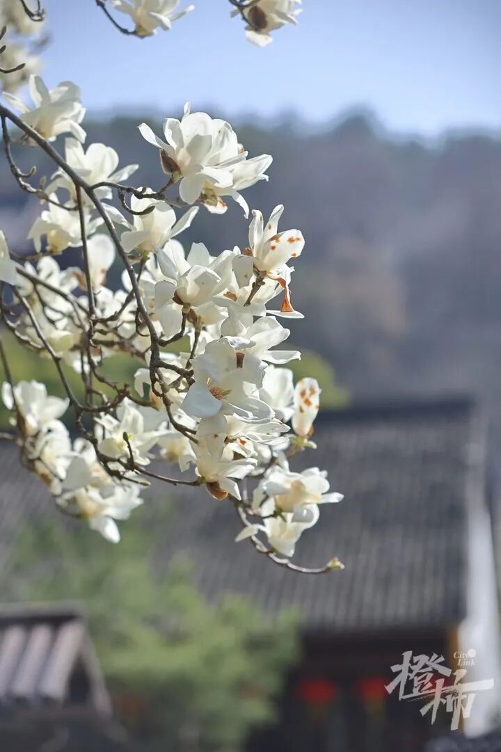 比如,餘杭徑山寺裡的兩株玉蘭,寺門口和觀音殿前的兩株古玉蘭已是白花滿樹。樹齡分別是315年和205年,枝幹粗壯,玉蘭盛開時朵朵素雅白淨,幽香陣陣,沁人心脾。