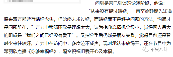 至於分手原因,猜測很多,不乏狗血的三角插足傳聞。對此,鄧麗欣否認有第三者,說是因為了解而分開。