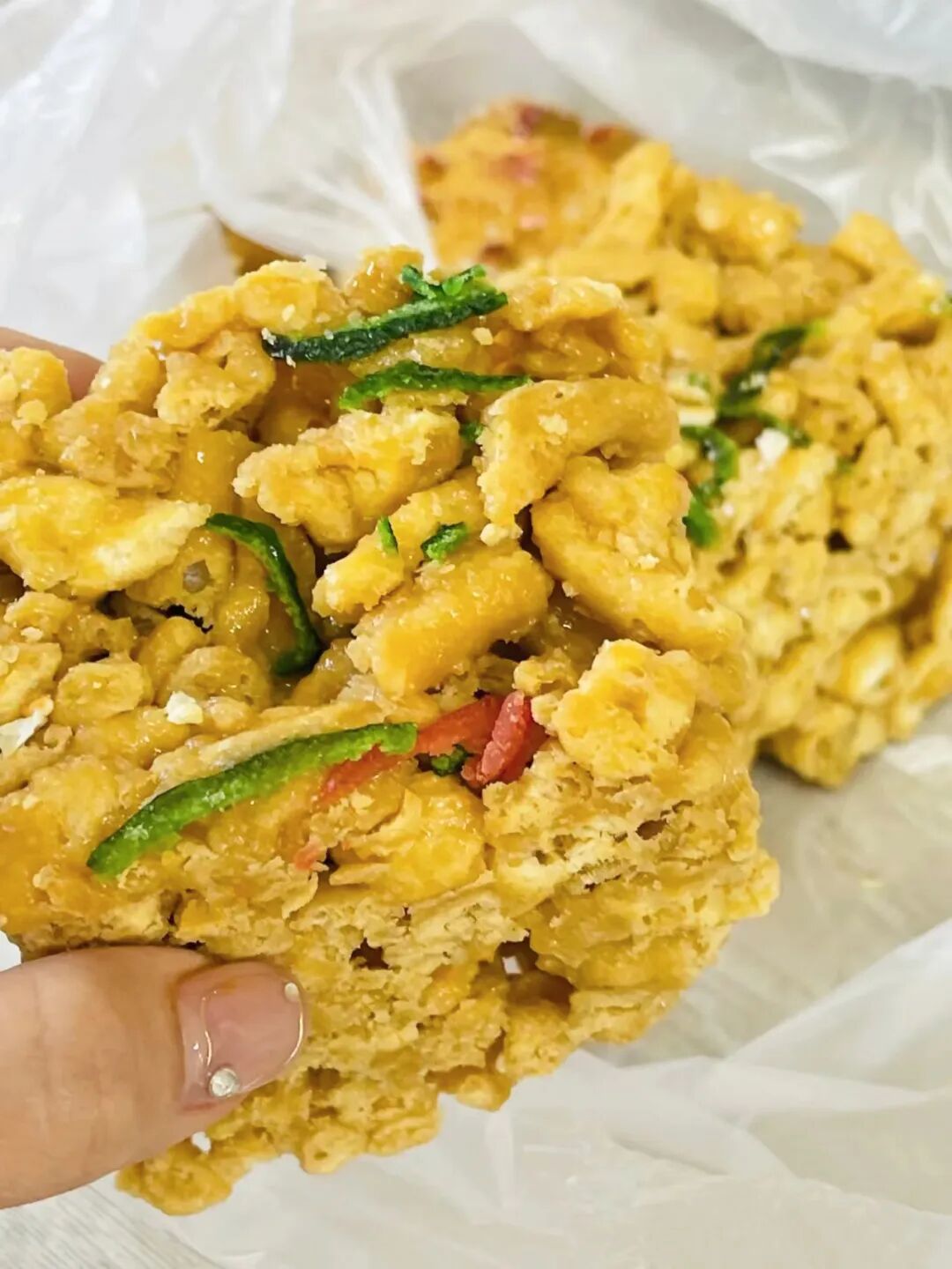 這種用麵筋做成的點心,每一塊都呈現出油潤有光澤的乳白色,色澤分明的青紅絲點綴其上,咬一口酥鬆滋潤、人口化渣,內部細峰窩狀的細密質地充滿有蜂蜜的香味。