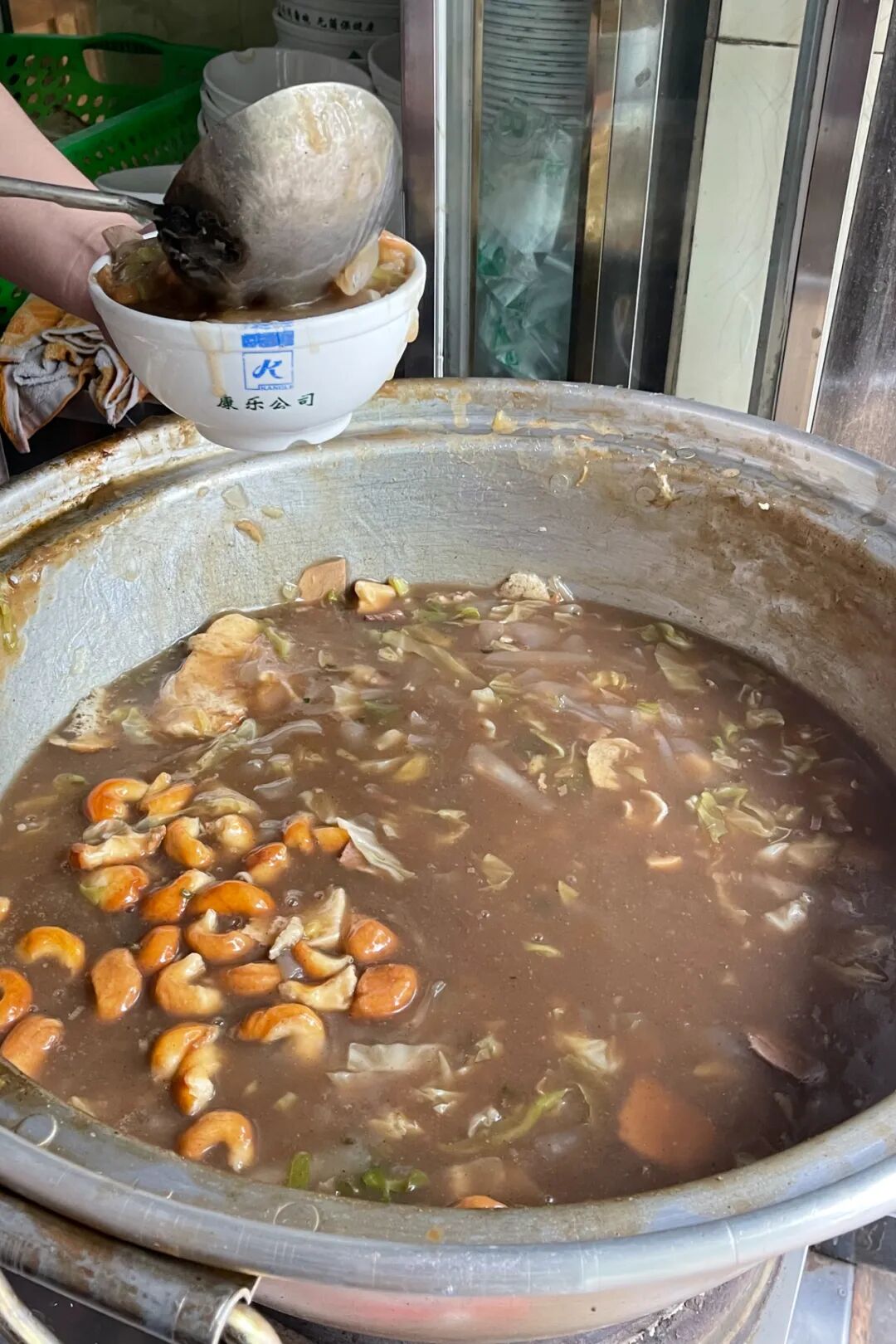 一碗牛肉粉皮面筋端上桌,只見牛骨和牛肉塊熬煮而成的肉湯裡,大塊麵筋醇香柔韌,既解餓又解饞;粉皮色澤晶潤,口感順滑;加之碧綠清脆的包菜浮動在稠滑的湯裡,散發著蔬菜的清香,十分催人食慾。