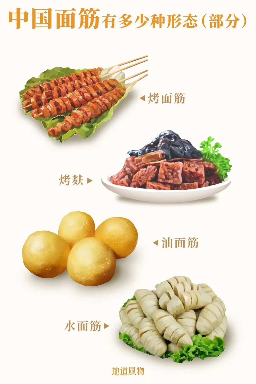 大江南北,長城內外,甘肅人的粉湯裡有它,內蒙古人的釀皮裡有它,陝西人的涼皮裡有它,河南人的胡辣湯裡有它,東北人的小燒烤裡有它,廣東人的牛雜裡有它,江浙人的素面裡有它,福建人的湯羹裡有它……中國人把小麥種到哪裡,哪裡的餐桌就擺上了麵筋做成的各色佳餚。
