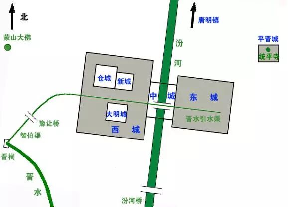 晉陽橫跨汾河,由西城為復體的西、東、中三座小城組成了一個城池綜合體,僅城門就有24座。晉陽的CBD位於西城,又名都城,晉陽宮城、倉城、大明城等重要建築都位於此。城外西北隅則有汛期防洪、平時防衛的羅城。後周太祖郭威一語道破了晉陽的重要性,“河東山川險固,風俗尚武,士多戰馬,靜則勤稼穡,動則習軍旅,此霸王之資也。”951年1月1日,劉知遠的弟弟劉崇在晉陽建漢稱帝,史稱“北漢”,這是十國中唯一的北境之國。