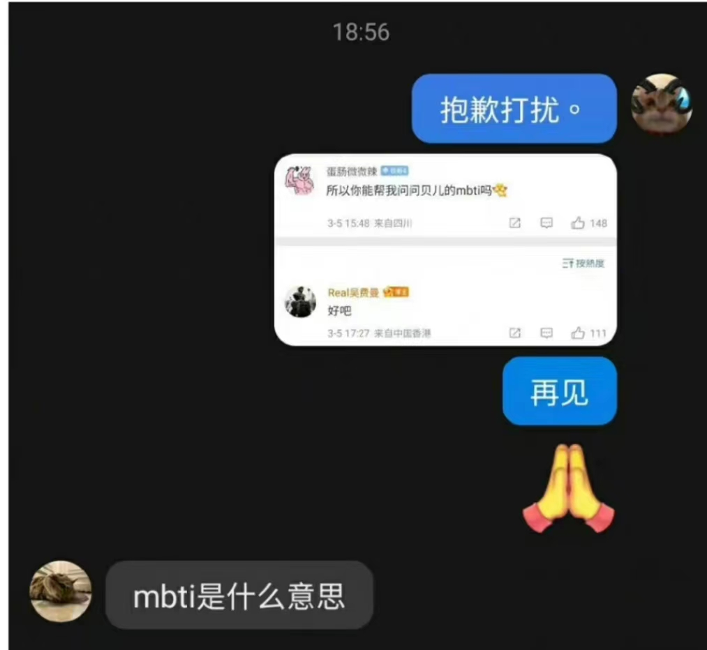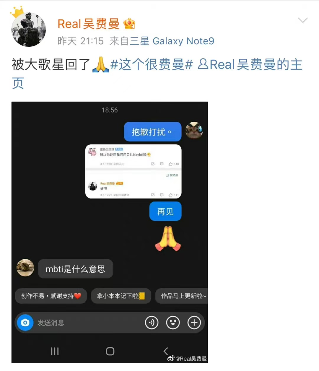 然後就在大家以為只是簡單的網絡問答時,有位網友問費曼:“你能幫我問問貝兒的mbti嗎?”