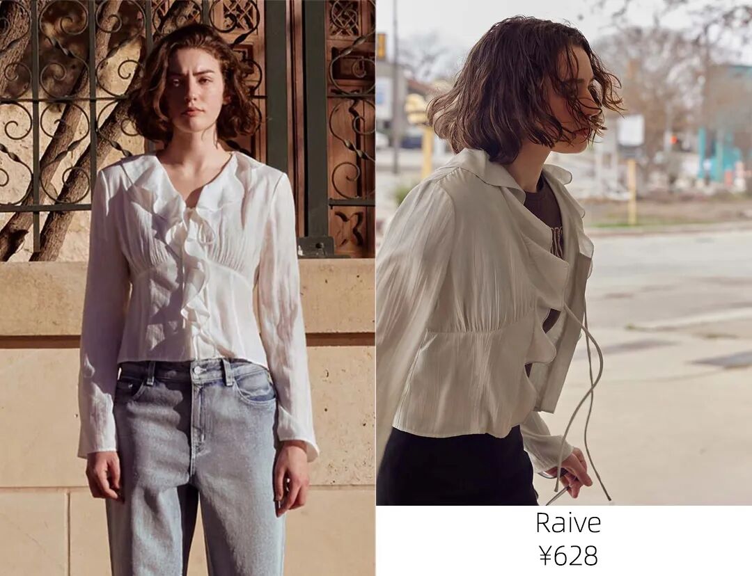荷葉邊襯衫他做成了可以敞開當外套的樣子,胸部以下,線條就開始收緊,設計師是懂顯高的。