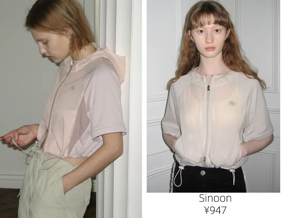 還有兩件挺有趣的輕薄運動外套,一件是中袖短款,衣襬下方做了抽繩設計,連帽更加少女有活力。