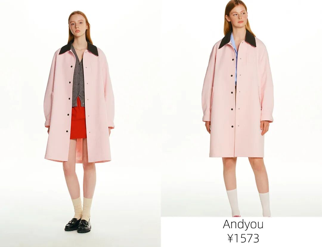 拼色風衣倒是蠻南法的,還用了粉粉嫩嫩的顏色,長度差不多到膝蓋上方的樣子,是小個子女生也能駕馭的。