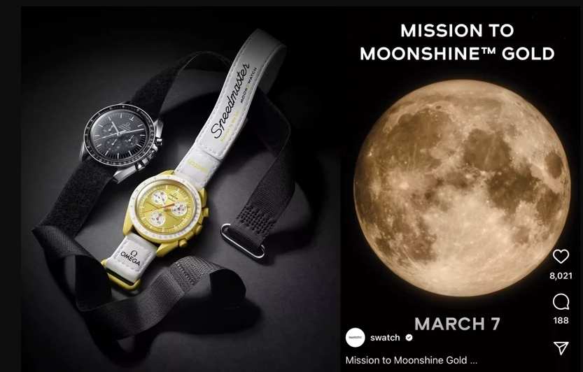 Swatch將於3月7日發佈與歐米茄聯名的全新系列手錶,預告視頻中顯示,此次腕錶靈感與月球有關,並提及了“Moonshine Gold”一詞,這是歐米茄在2019年註冊的一款商標,特指品牌獨特配方的18K黃金。區別於第一個系列,此次聯名款手錶將只在東京、蘇黎世、米蘭和倫敦四個城市的指定店鋪進行,中國市場暫時沒有發售點。延伸閱讀:深度 | 歐米茄和Swatch的腕錶聯名為何被瘋搶?