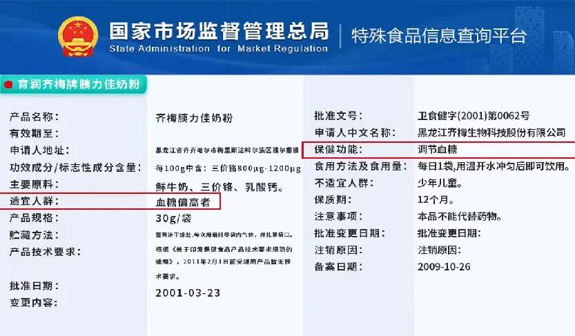 在2001年,中國衛生部認證批准該產品具備調節血糖功效,是目前市面上少數獲得藍帽認證的功效奶粉之一,獲得多項國家專利技術!