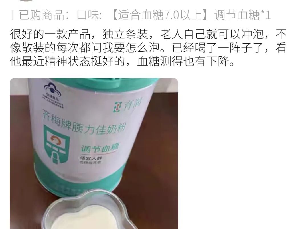 買過的粉絲紛紛留言“血糖降下來了,不錯的奶粉”“老人自己就可以沖泡,現在精神狀態很好,血糖測得也有下降”。