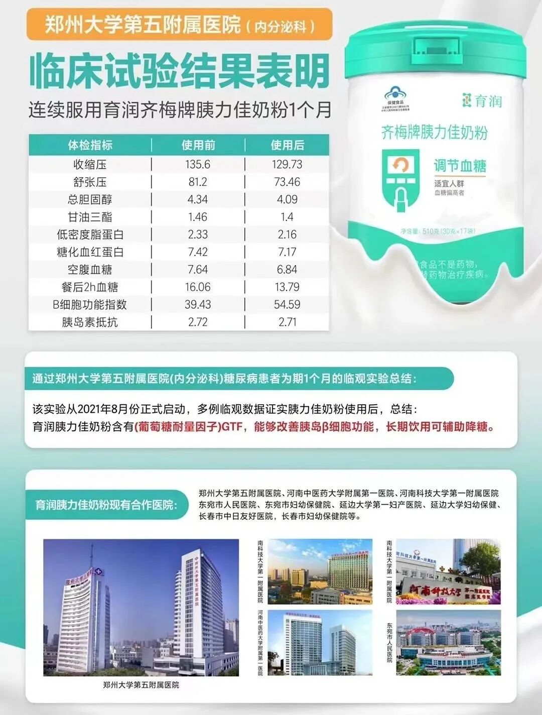 鄭州大學五附屬醫院內分泌科的糖尿病患者在喝了1個多月胰力佳奶粉後,與之前的體檢指標相比。空腹血糖、餐後2h血糖、胰島素抵抗都下降了!