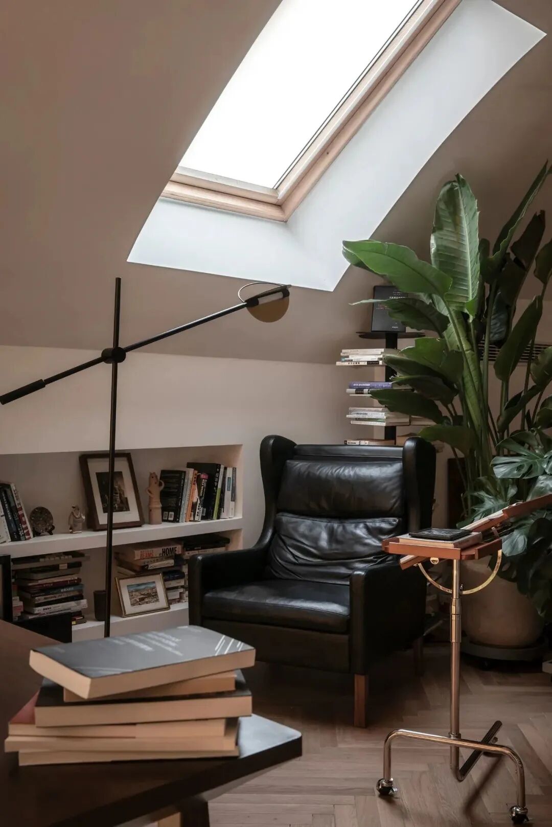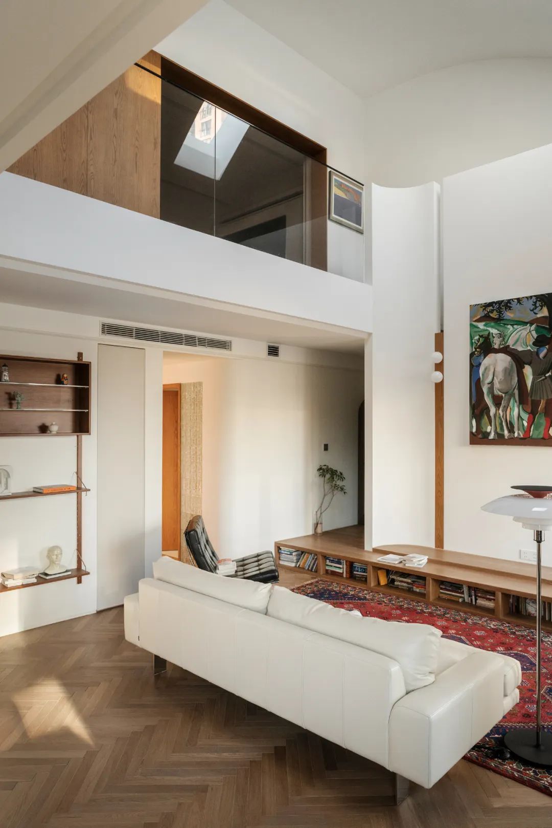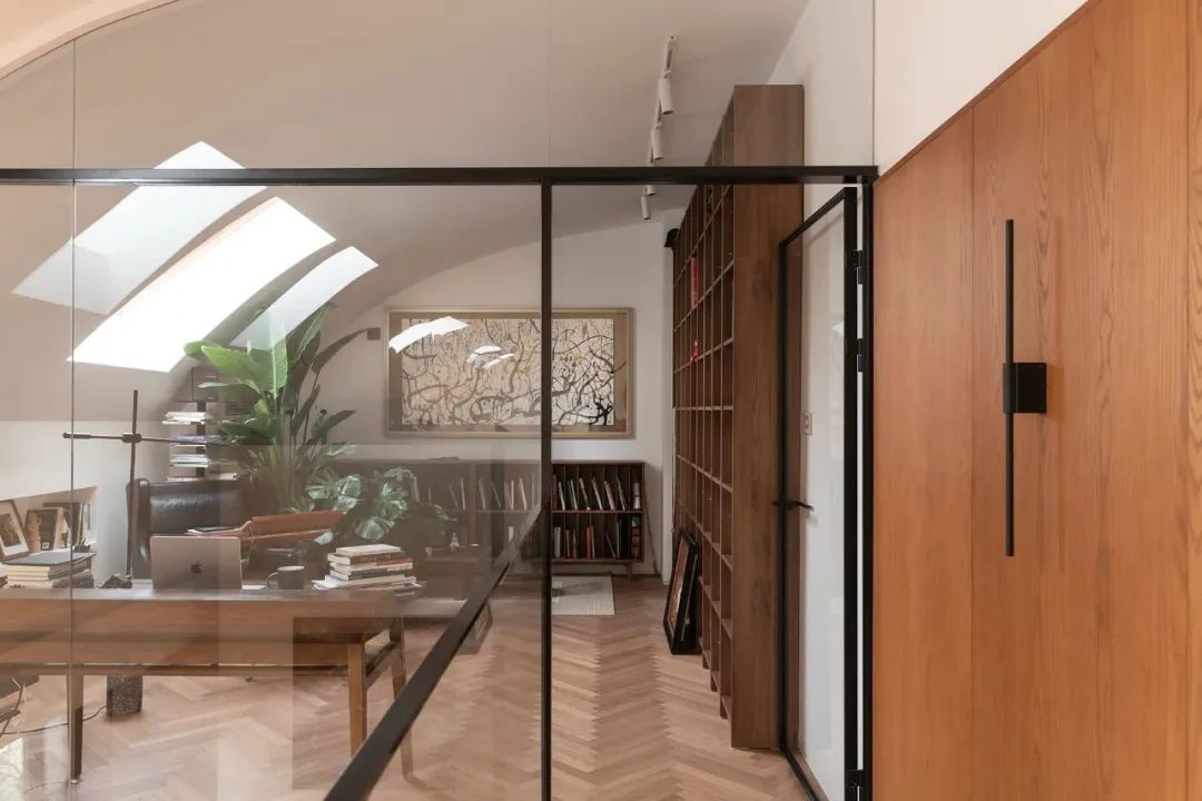 走進這間頂層帶拱形屋頂的房子,觸目所及是幾千本放置在臺階、地臺、書房等地方的書籍。它們既是書本、也是裝飾,讓書香縈繞在家裡的每個角落。