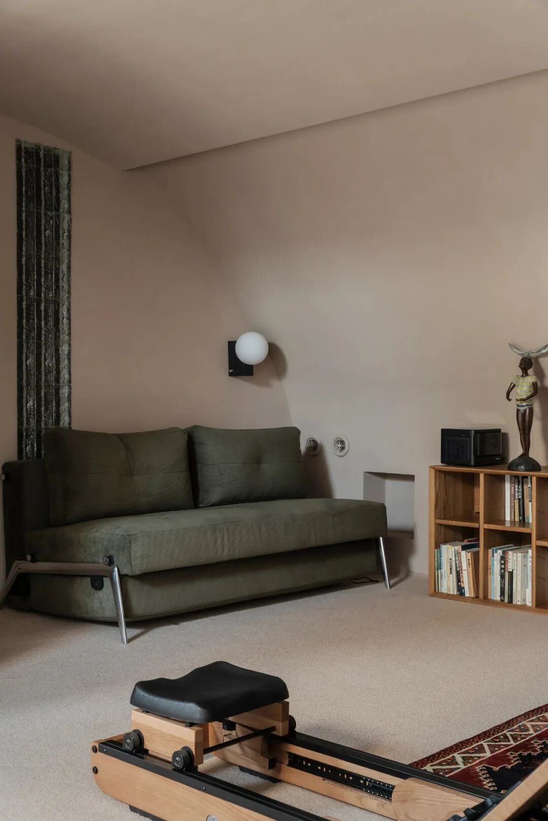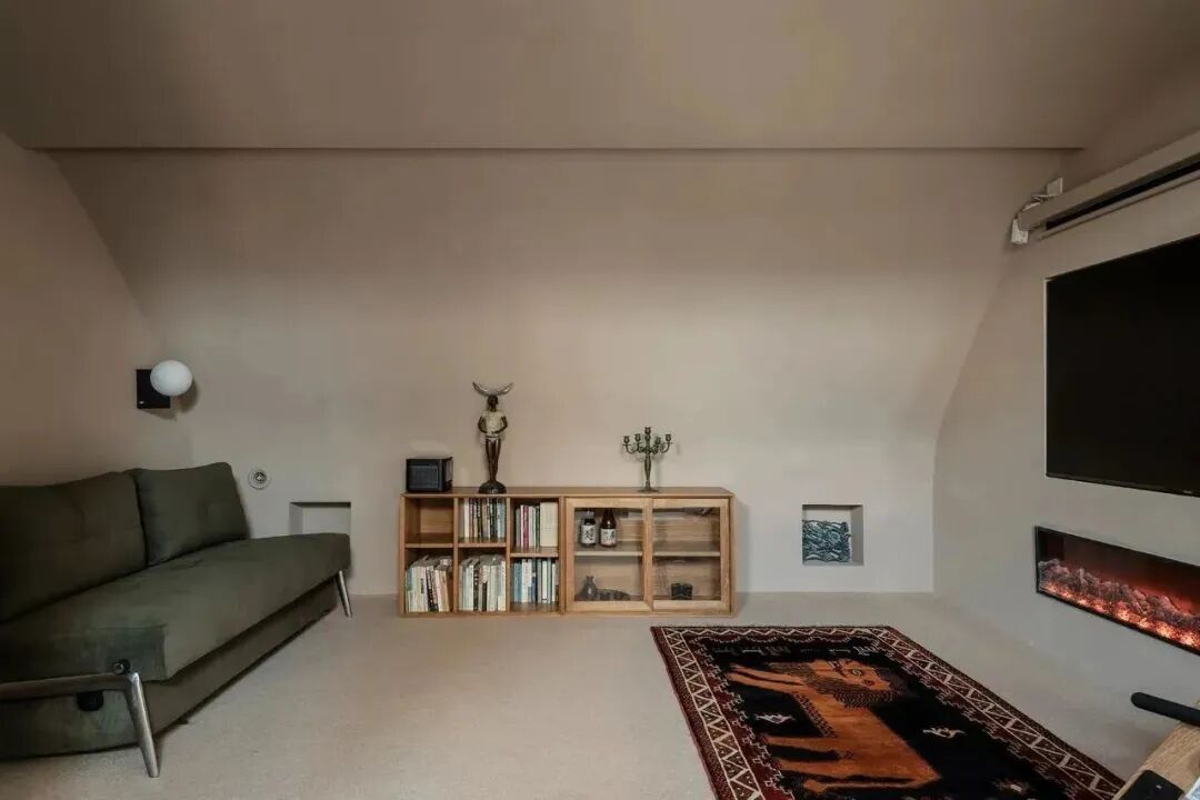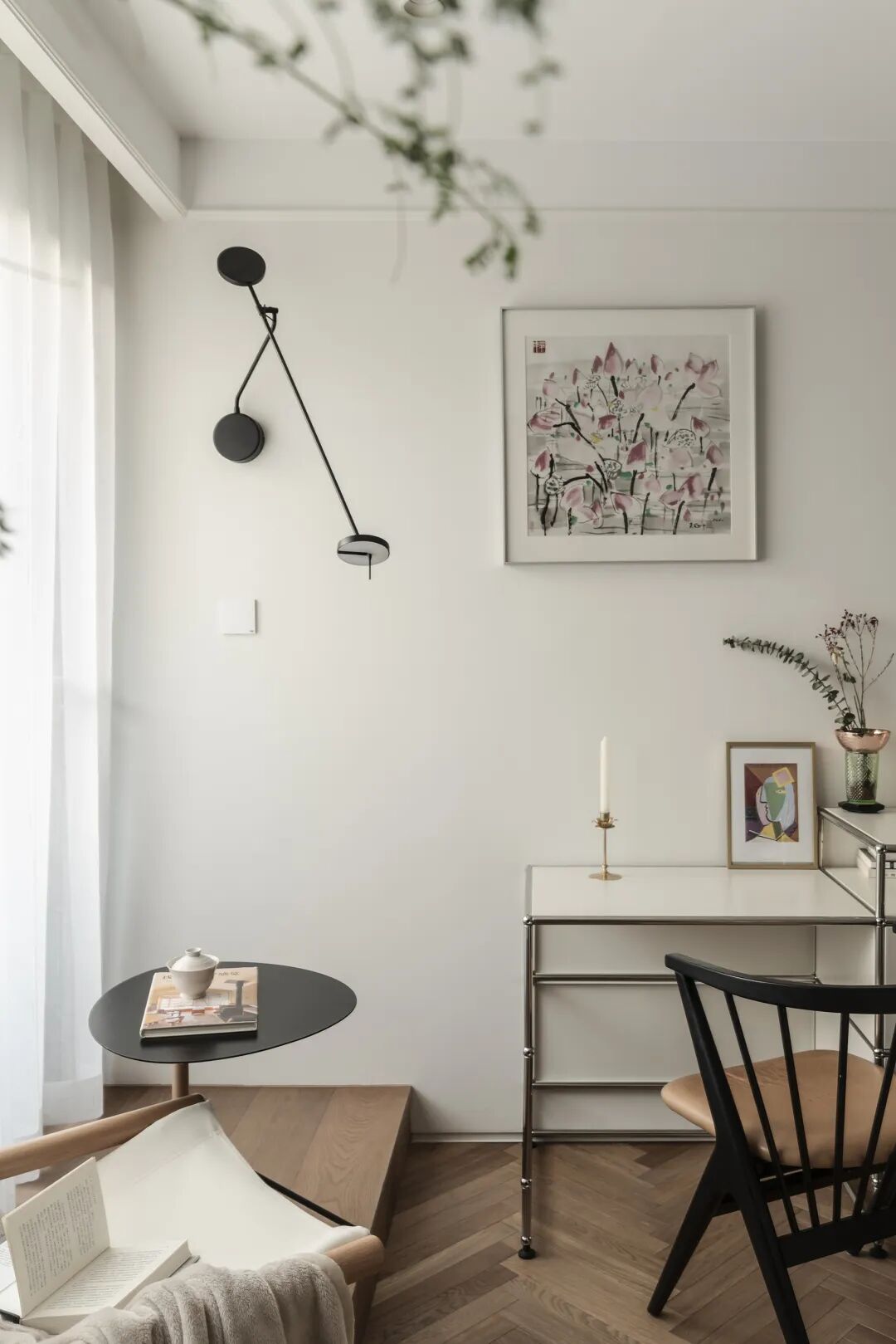 書房和圓形頂面完美融合,天氣好的時候,會有陽光灑進來,在這裡辦公都變得愜意起來。房間雖然不大,但依然在其中安排了辦公區、閱讀區、休閒區。