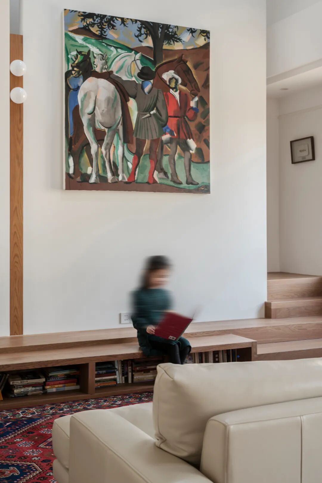 客廳的臺階裡,藏了很多書,屋主女兒平時在這玩兒的時候,隨時翻出一本,就能有滋有味地讀起來。