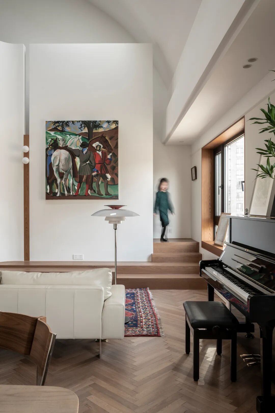 在這戶三口之家裡,最原始的需求是給予逐漸長大的女兒一個獨立的房間,延伸而來的則是一家三口的興趣愛好及功能需求。為此,設計師在凸顯原本房屋結構的基礎下,通過各個空間之間的巧妙串聯,展開了室內空間的功能再造及景觀展現,由此呈現出更豐富的意象和更活潑的生活樂趣。