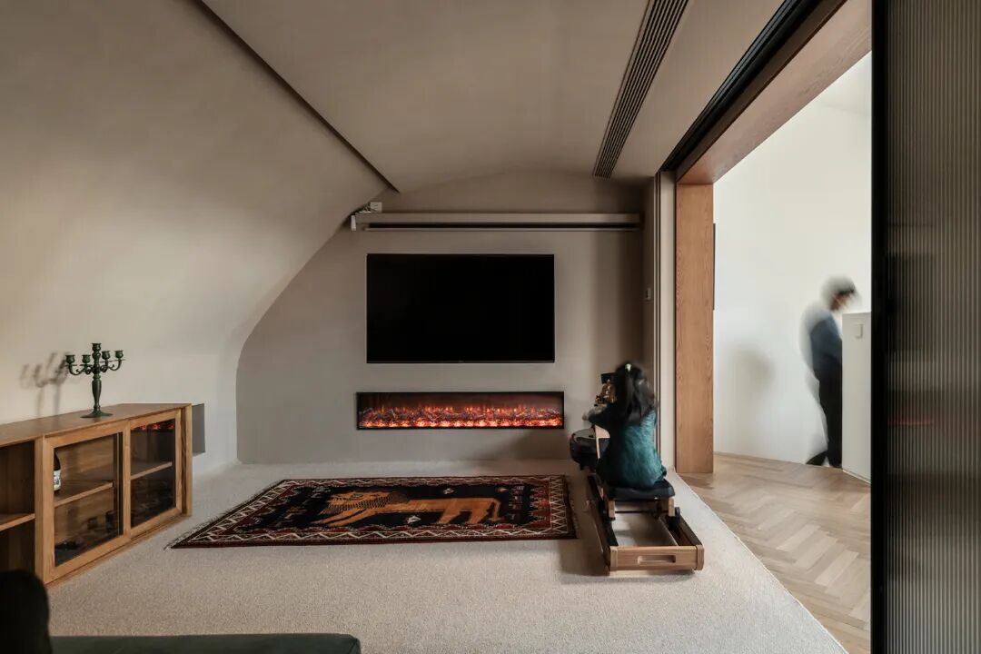 在裝修選材上,屋主也和設計師探討了新材料的運用,比如二樓影音室牆面選擇了微水泥和黏土,加上弧形牆頂的造型,創造了一種舒適的安定感,天然色系的主色調也讓視覺整體得到放鬆與舒展。