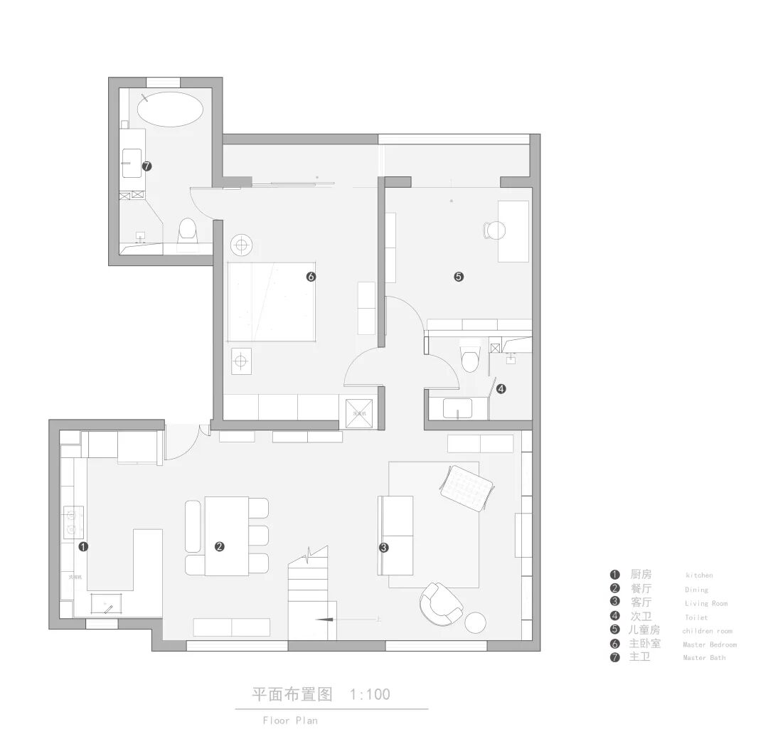 類似這樣結構上的“巧思”在這間屋子裡還有很多。比如整個一層的公共區域化身成了融廚房操作檯、中島、餐桌、沙發、地臺五段於一體的客廳,一家三口可以在公共區域內的不同場所、通過不同高度傢俱的搭配“打造”令各自舒適的領域。