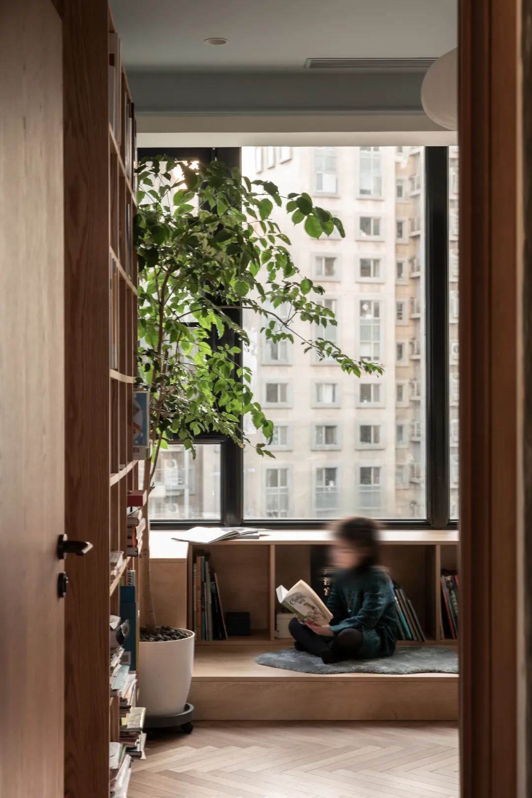 將窗臺邊改為可以藏書的地臺,在地臺上加一塊毯子,盤腿坐下後隨手從旁邊的格子裡抽出一本書,就能安靜度過一整個下午。