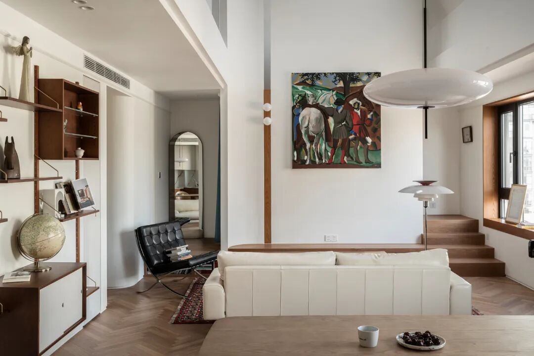 原始房屋的樓梯位於一層中間,分割了客廳和餐廚,讓整個公共區域顯得有點狹小。在樓梯位置的重構上,Raymond和設計師不謀而合:將原本厚重的樓梯挪到最裡面靠牆的位置,並藏在了一堵方牆的後面,和二樓拱形的頂形成了一個有趣的映照。這樣一來既滿足了功能上的需要,又彰顯出房屋本身弧頂的特點。樓梯不再是一個單一的輔助工具,“通過樓梯組織起樓上樓下的聯通,讓樓梯作為空間裡面的景觀存在,在讓其‘隱身’的同時,反而讓樓梯外側的造型感更強。”