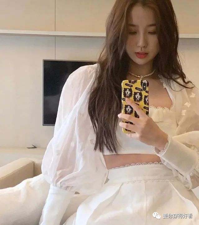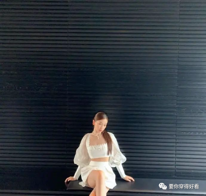 胸前還有蝴蝶結和蕾絲邊做裝飾點綴,袖子上也是有著一個個小蝴蝶在裝飾著,原本是仙女十足的上衣被裝飾著超級甜美,短裝的設計將腹部露出來,提高了腰線也展現了平坦的腹部,和下裝的距離透露出屬於女性的性感魅力,而且這個短裝其實對胸小的女生還是很友好的。