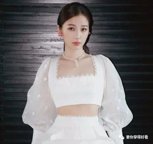 公主袖還有一個特點在領口,大多方型領口為主,盡顯歐洲貴婦氣質的領口,但在虞書欣的這件公主蝴蝶袖上卻透露出一股子青春活力、清新甜美的感覺。袖子偏長,一半以蝴蝶袖為設計,一半為公主袖為設計,二者相結合,公主袖的部分將虞書欣的手臂纖細特點顯露出來,而上半部分的蝴蝶袖又恰好將大多數人上手臂的缺點遮住,雖然我知道虞書欣肯定沒有手臂的拜拜肉。