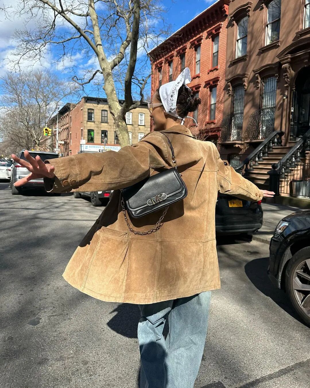身上穿了本季很火的麂皮外套,搭配闊腿褲、復古墨鏡,圍上小頭巾~套一句流行詞“都市波西米亞”,說得就是她吧?