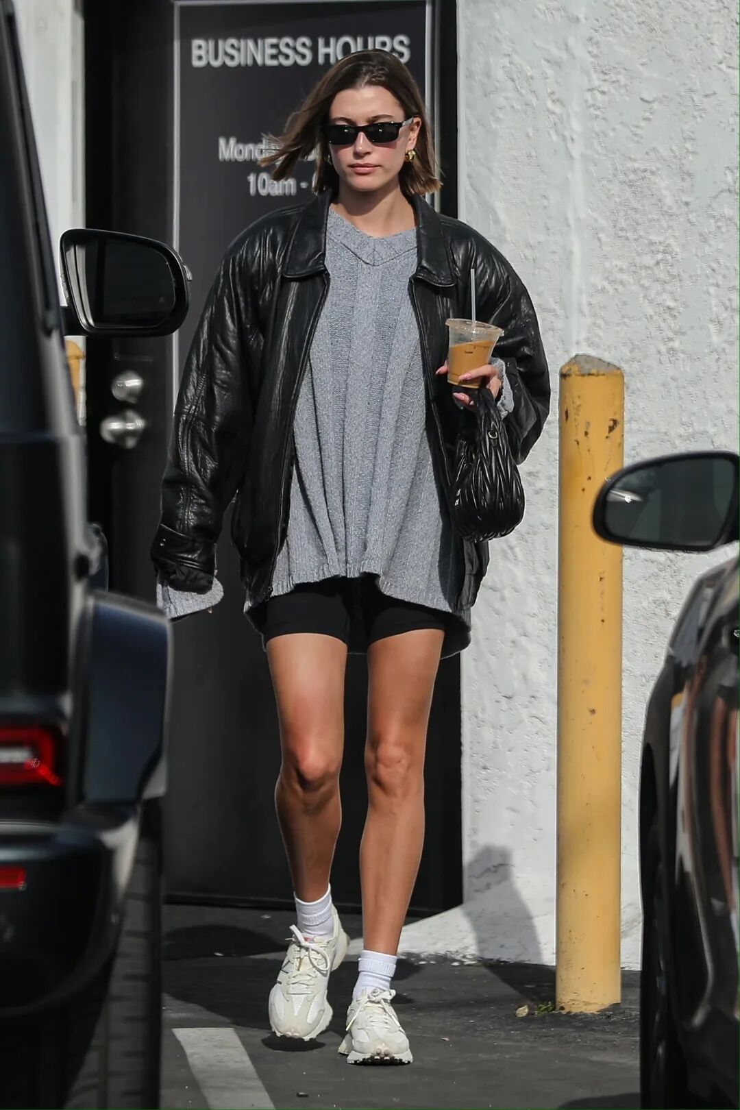 這個千鳥格西裝本身就是寬鬆的休閒款式,加上Hailey喜歡買大兩個號的外套,穿起來更有種隨意感。內搭露臍背心和運動褲、厚底皮鞋,讓整個搭配在減齡、變時髦的基礎上,又帶點復古有趣。